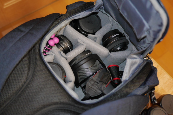 その他、標準ズーム18-55mmとパンケーキ24mm or 40mmなら何とか収まる。